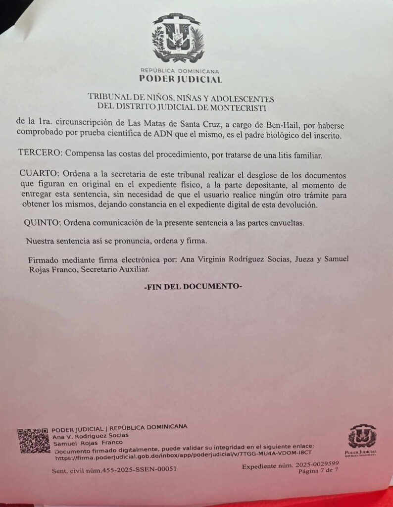 De acuerdo con la doctora Jiménez, el caso cuenta con una sentencia judicial vigente y ya se habría realizado una prueba de ADN dentro del proceso legal correspondiente.